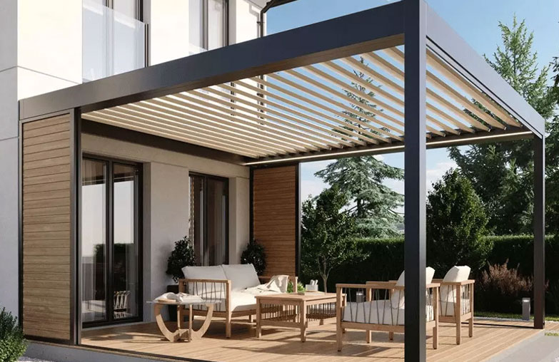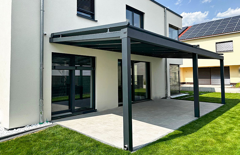 Modernste Überdachungstechnologie mit verstellbaren Lamellen, die Licht und Luft individuell regulieren.